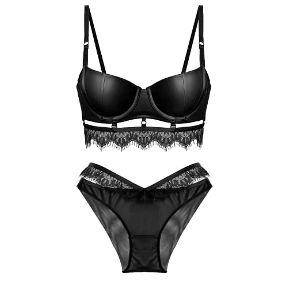 • Style - Push up bra add 1 cup sizes, Panties and bra sets for women sexy, Blackleather bra panty set, Sexy balconette bra set.