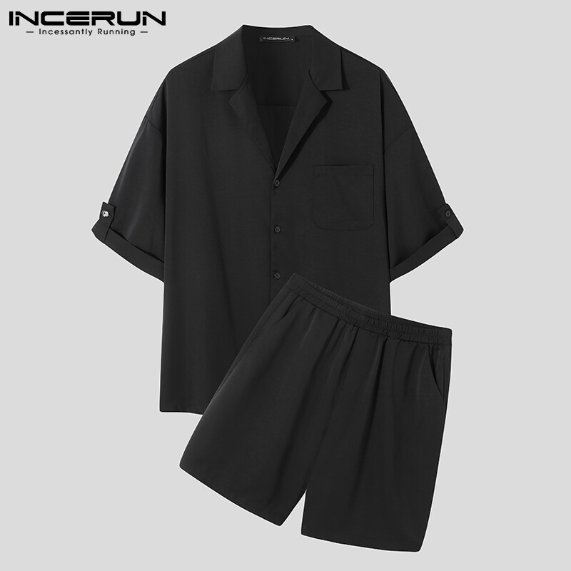 INCERUN Men Short Sleeve Korean Style Casual Suits Button Shirts Elastic Waist Short Sets (Korean Style)