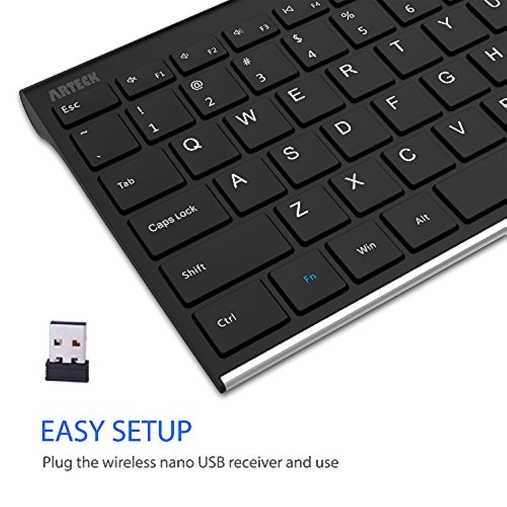 Package contents: Arteck Stainless 2.4G Wireless Keyboard , nano USB receiver, USB charging cable, welcome guide, our 24-month warranty and friendly customer service.