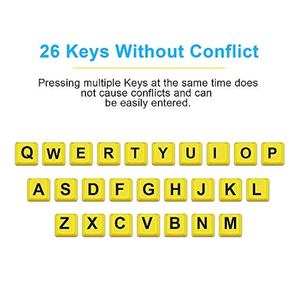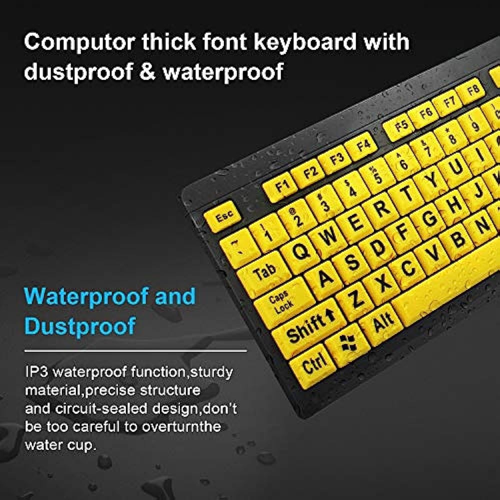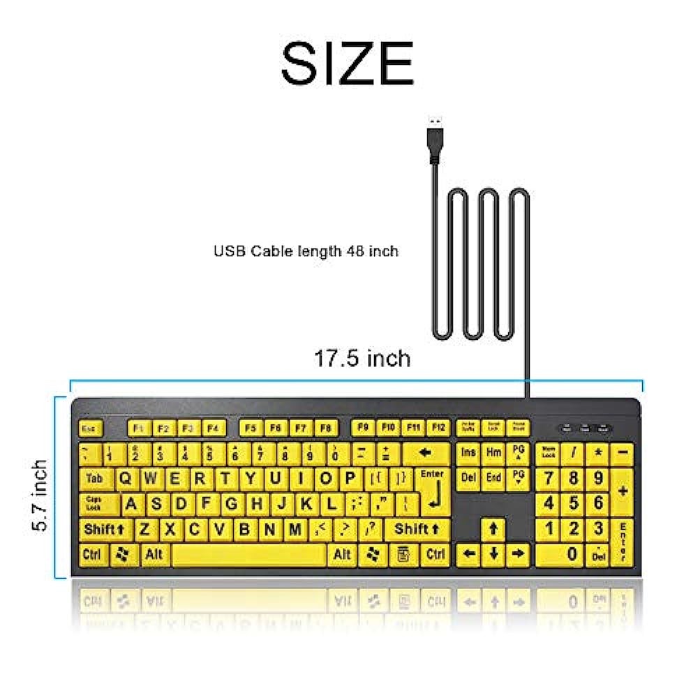 【 High Contrast】 Large print keyboard offers increased visibility with easy to see yellow key caps and crisp large print black letters, Easily seen print, even in low light. With a life cycle of 5 million keystrokes, membrane key switches provide a faster response along with a quieter typing experience.