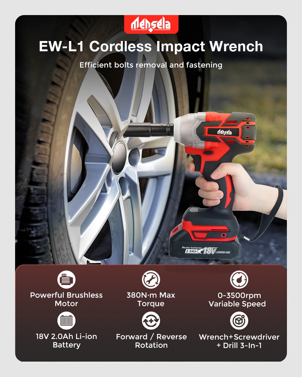 Mensela EW-L1 3台1 18V3500RPM 380N.M无刷冲击扳手1/2"夹头3 速无线充电螺丝刀钻头带无/1/2 2.0AH 电池 LED 工作灯