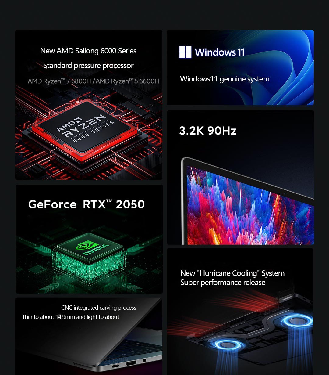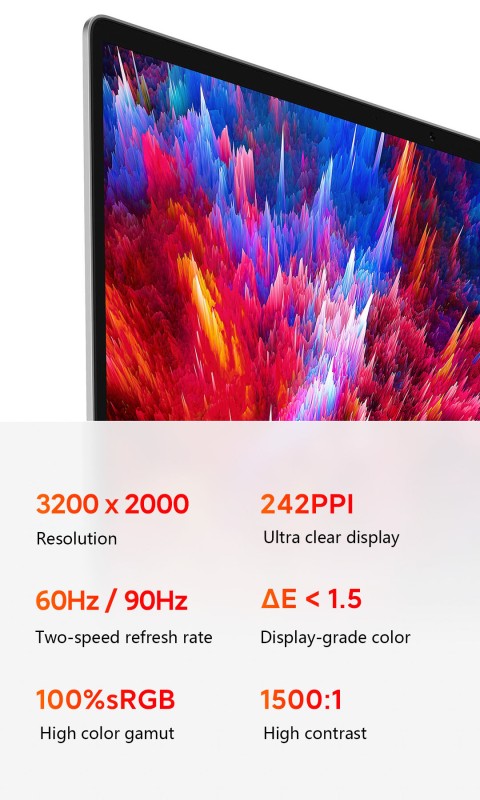 15.6 inch 100% sRGB 400nits 16:10 Display with 3200 x 2000P Resolution 90 Hz Refresh Rate Screen For Smoother Gaming Experience AMD Ryzen R5-6600H Octa-Core Sixteen Threads, 3.3G Hz up to 4.5G Hz · NVIDIA GeForce RTX2050 GPU 4GB GDDR6